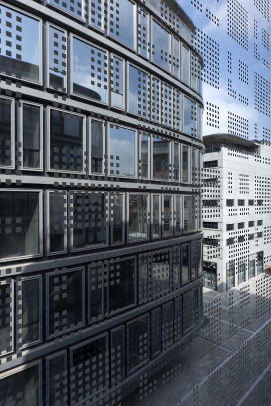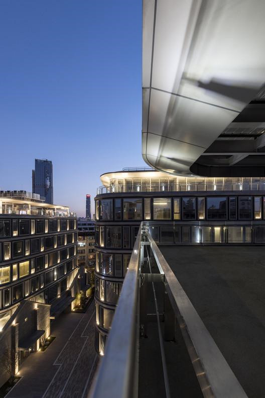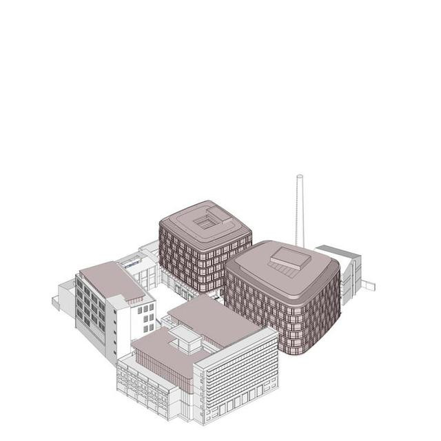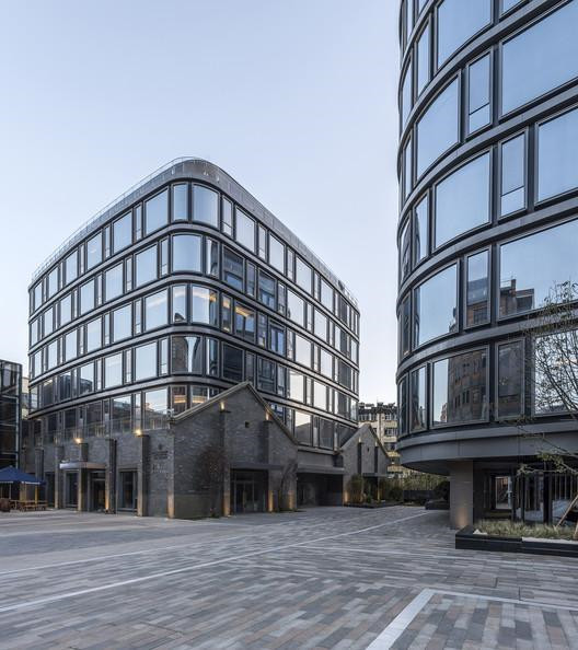然后,兩個(gè)新的弧形玻璃體量被柔和的嵌入基地中。建筑柔軟的形態(tài)和尺度上是柔和的方式介入而立面建筑的立面采用了高大通透的玻璃盒子簽入層層的樓板間,已取得和老建筑在尺度上的呼應(yīng)與對(duì)比則是對(duì)比底層的架空讓建筑漂浮在場(chǎng)地中,保持底層的通透性的同時(shí),重構(gòu)了場(chǎng)所的內(nèi)部公共空間和街區(qū)的完整性。在新建筑和公共空間的場(chǎng)地下方開(kāi)挖了2層地下室,滿(mǎn)足了這個(gè)地塊的停車(chē)和機(jī)電需求。