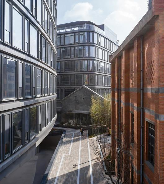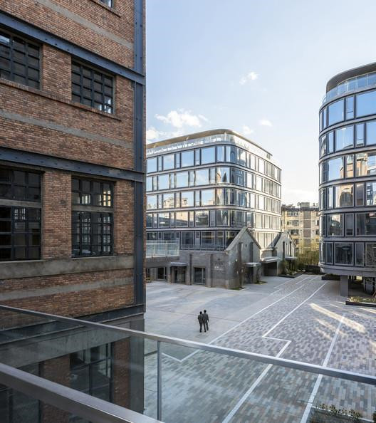 其次,對(duì)保留下來(lái)的原有廠區(qū)的5棟老房子和一座煙囪——周邊最高的構(gòu)筑物,和北側(cè)的東寺白塔對(duì)峙——進(jìn)行加固,適應(yīng)性再利用的改造。老建筑肌體盡可能完好的保留其既有的立面肌理,而加固的和適應(yīng)性的加建采用了與老建筑截然不同的肌理——鋼結(jié)構(gòu)、金屬飾面和玻璃:新混煉大樓的中庭、老混煉大樓屋頂?shù)牟Ad和室外露臺(tái)以及樓梯;聯(lián)系兩棟樓天橋;鍋爐房的金屬屋頂和室外樓梯等。這些新的構(gòu)件不僅滿(mǎn)足了每棟樓對(duì)當(dāng)代空間和功能的適應(yīng)性,同時(shí)把建筑真實(shí)的歷史呈現(xiàn)出來(lái)。