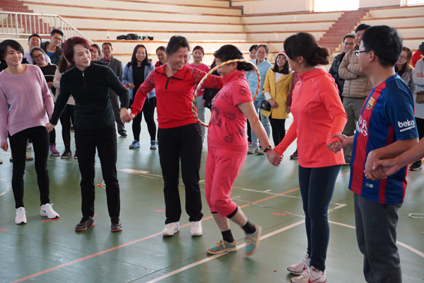 傳遞呼啦圈時,各組成員手拉手,將呼啦圈從自己的胳膊繞過頭部、身體、腿部,再傳遞給左手邊的人,讓更多人體會團隊協(xié)作的重要性。
